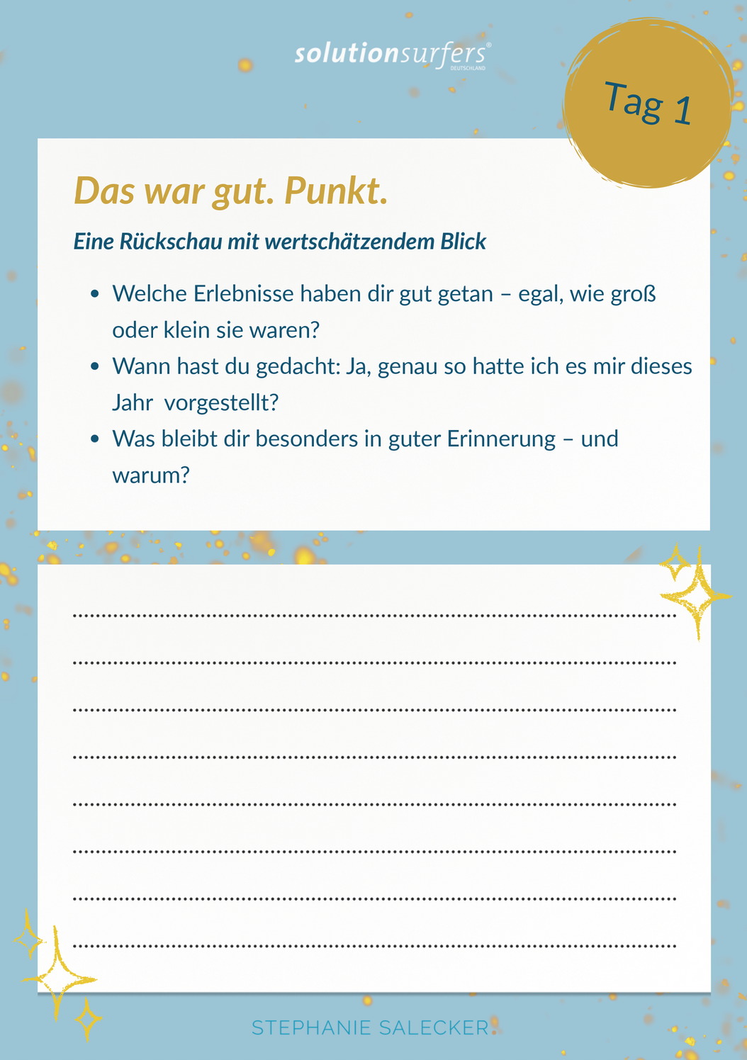 Start: Wann immer es für dich passt – klassisch am 25. Dezember oder einfach dann, wenn du diesen Raum für dich aufmachen willst. Und falls dir an einem Tag gar nichts einfällt? Dann gilt: Ein Fragezeichen im Kopf ist manchmal der beste Startpunkt überhaupt.
